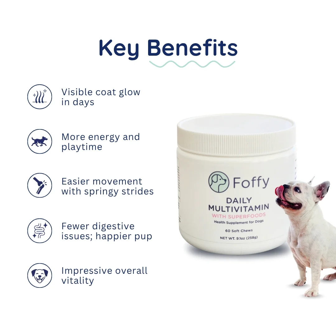 Give your pup the daily boost they deserve. These multivitamins combine essential nutrients with natural superfoods to support energy, digestion, joints, and coat health—all in one easy chew. Tested and recommended by the WildPooch review team for noticeable vitality and glossy coats.